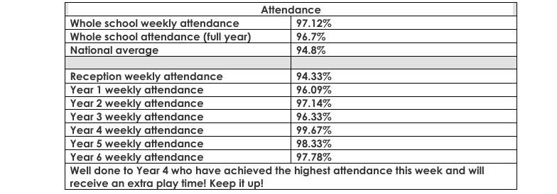 Attendance – Well done everyone, our whole school attendance is excellent!