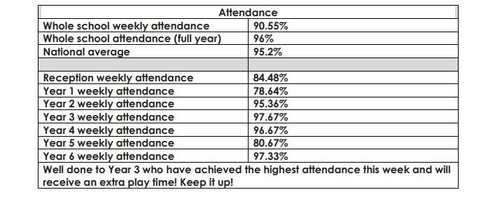 A very nasty virus has really impacted on our attendance in school over the last two weeks. I hope that the children are now feeling better and over the worst of this and we see an upturn in our attendance back to our usual excellent standard next week.