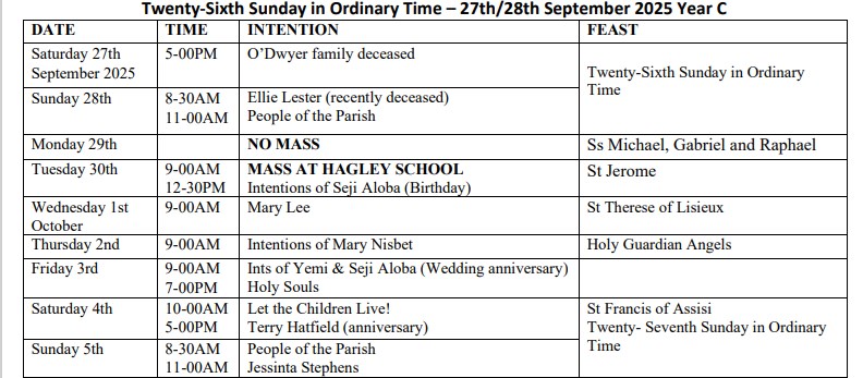 Wednesday 22nd October – 2:20pm – Key Stage 1 Mass (parents welcome to attend)