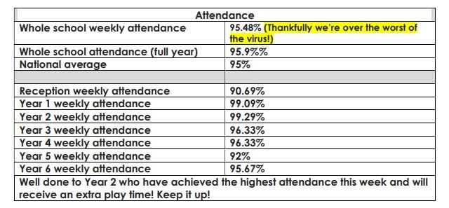A very nasty virus has really impacted on our attendance in school over the last two weeks. I hope that the children are now feeling better and over the worst of this and we see an upturn in our attendance back to our usual excellent standard next week.