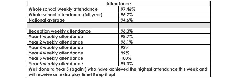 Attendance – Well done everyone, our whole school attendance is excellent!