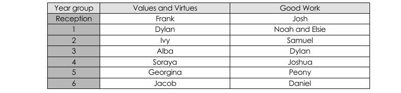 The following children have received a certificate in today’s Gifts from God assembly. Well done children!
