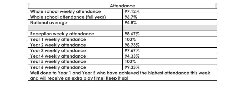 Attendance – Well done everyone, our whole school attendance is excellent!